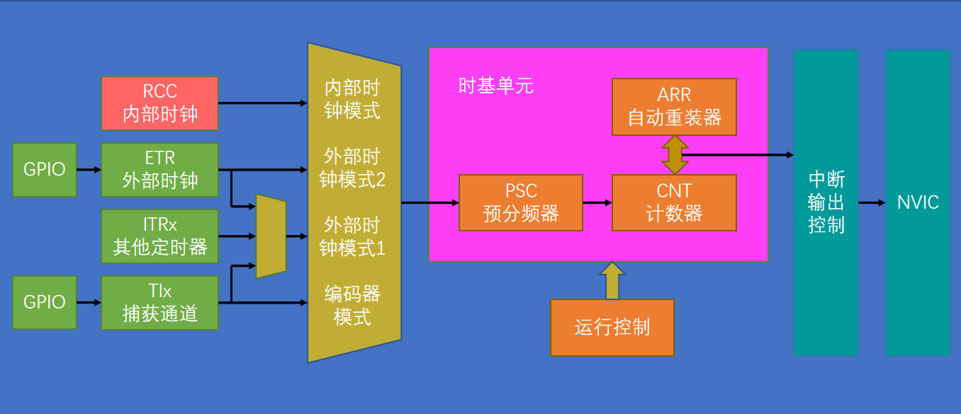 首先需要就是时钟源的选择,可以选择RCC内部时钟,或者如果是通用定时器,高级定时器,还可以选择ETR外部时钟,ITRx其他定时器,TIx捕获通道等,接下来就是配置时基单元(PSC,CNT,ARR寄存器),然后就是到达ARR设定的值之后,产生一个中断或者事件,如果是一个中断的话,需要对中断输出控制,然后NVIC的配置,最后不要忘了对定时器使能。具体的配置结构图如下: