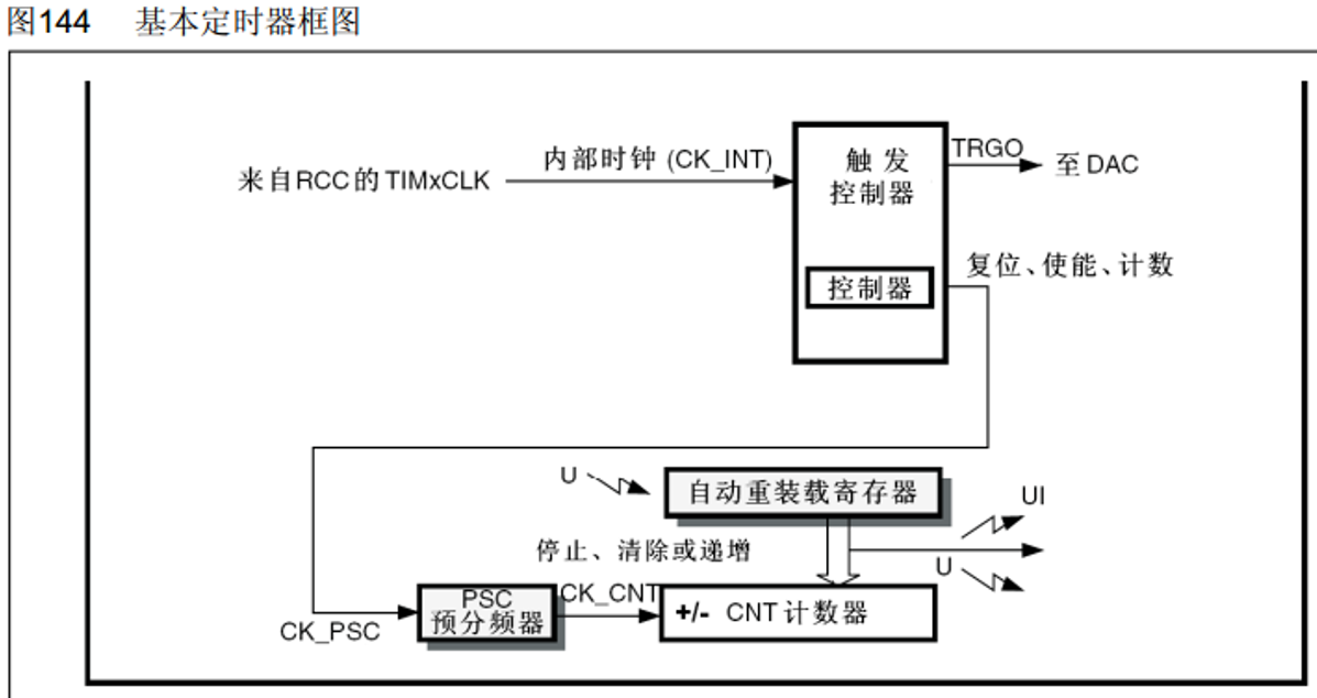 可以这么理解,定时器通过选择内部时钟(72MHz),经过一个触发控制器,再经过PSC预分频器得到CK_CNT,每多少频率记一次数,当达到自动重装载寄存器(ARR)的值时,就可以触发一个中断或者一个事件。但是基本定时器不具备输入捕获和输出比较等功能。