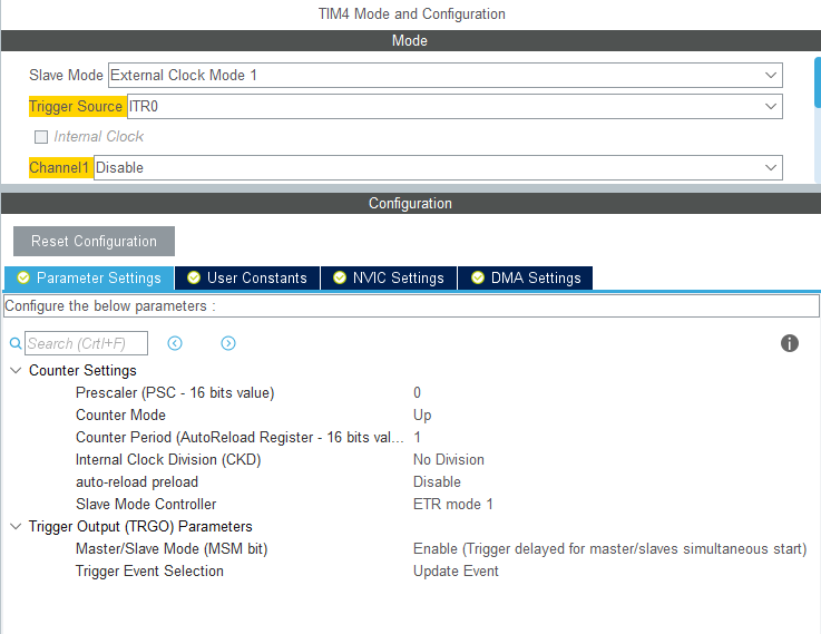 这里我使用的是定时器1发送脉冲,定时器4记录脉冲个数,所以定时器1工作在主模式,定时器4工作在从模式。