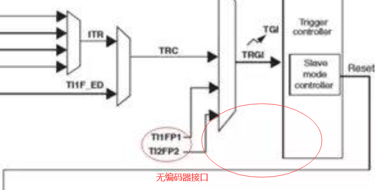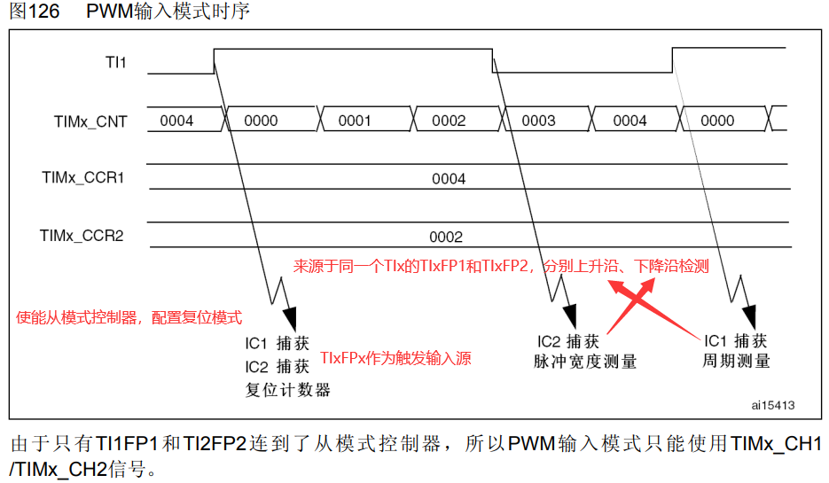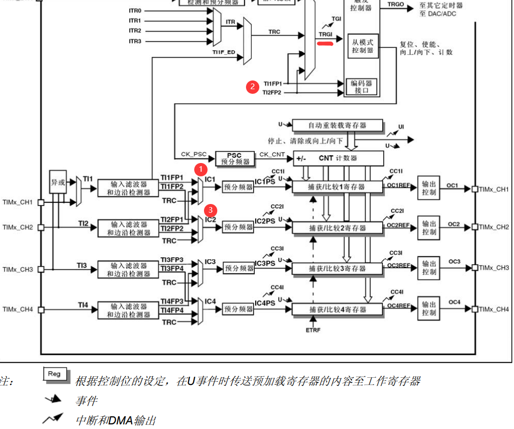 注:PWM输入模式同时且仅使用了TI1和TI2,只有TI1FP1和TI2FP2接到了从模式控制器。
