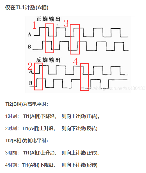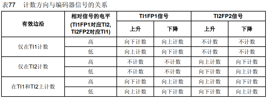 解读上图(以“仅在TI1计数”为例):相对信号(TI2)作为参考,当TI2为高电平时,检测TI1FP1电平。若检测到TI1FP1上升沿,则定时器的计数器向下计数(自减),即反转;若下降沿,则向上计数(自增),即正转。