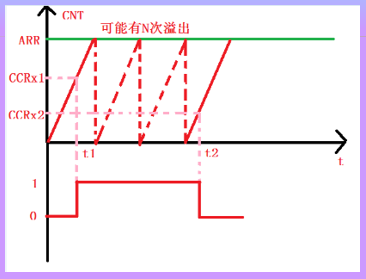 从上图可以看出,t1-t2 时间就是我们需要测量的高电平时间,假如定时器工作在向上计数模式,测量方法是:首先设置定时器通道 x 为上升沿捕获,这样在 t1 时刻,就会捕获到当前的 CNT 值,然后立即清零 CNT,并设置通道 x 为下降沿捕获,这样到 t2 时刻,又会发生捕获事件,得到此时的 CNT 值,记为 CCRx2。根据定时器的计数频率,我们就可以算出 t1-t2 的时间,从而得到高电平脉宽。在 t1-t2 时间内可能会出现 N 次定时器溢出,因此我们还需要对定时器溢出进行处理,防止因高电平时间过长发生溢出导致测量数据不准。CNT计数的次数等于:N*ARR+CCRx2,有了这个计数次数,再乘以 CNT 的计数周期,即可得到 t2-t1 的时间长度,即高电平持续时间。