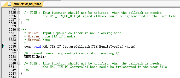 打开 stm32f1xx_hal_tim.c HAL库定时器接口文件,找到输入捕获中断处理回调函数 HAL_TIM_IC_CaptureCallback()