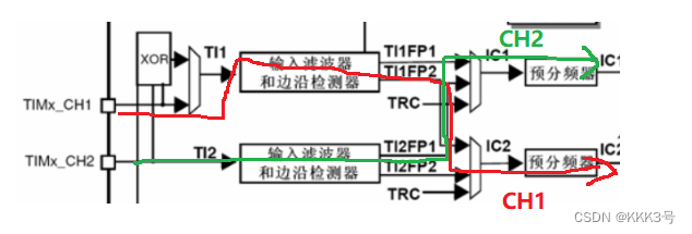设置输入捕获映射通道,换句话说就是同一个定时器的不同通道捕获到的信号需不需要互换的的设置,它们如果交换那么关系如下图: