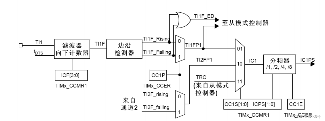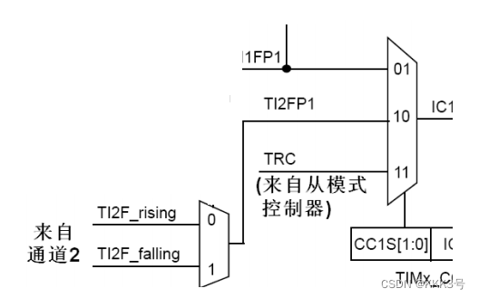 它是由TIMx_CCMR1寄存器的CC1S位配置的,一般情况下,我们就只需要设置那个通道捕获到信号就由那个通道对于设备处理即可。
