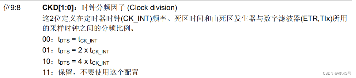 剔除的方法也很简单,就是多次检测,如果每一次检测的结果都为需要的结果,那么我们就认为这个高电平是有效的,而我们设置的信号触发后单次采样的采样的频率f DTS。但是这个频率总得有个来源吧,于是我们使用定时器的时钟频率CK_INT作为它的来源。而定时器TIMx_CCMRx的ICF位就用于选择配置滤波器,但是f DTS与f INT之间的关系的配置需要使用。 TIMx_CRx位去配置: