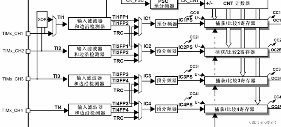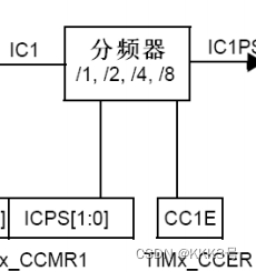 输入捕获的工作原理:预设分频系数,和捕获沿,检测定时器通道输入的边沿信号,当信号发生跳变并且满足预设条件时,将定时器当前值寄存器CNTx的值存入捕获比较寄存器CCRx中。