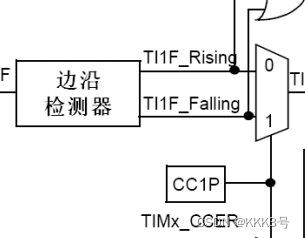 这部分主要是用于设置捕获的是上升的信号沿还是下降的信号沿,它是由CCER的CC1P位来配置的。所谓上升沿,就是由低电平变成高电平的瞬间,下降沿就是由高电平变成低电平的瞬间。我们可以设置需要捕获哪一个时候的变化。