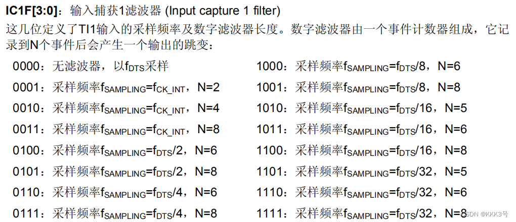 而设置需要的采样次数x则由TIMx_CCMR1寄存器的IC1F位来配置: