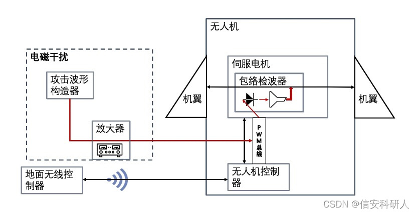 蓝色虚线框是受害者系统,也就是无人机系统,红色虚线框是攻击者。