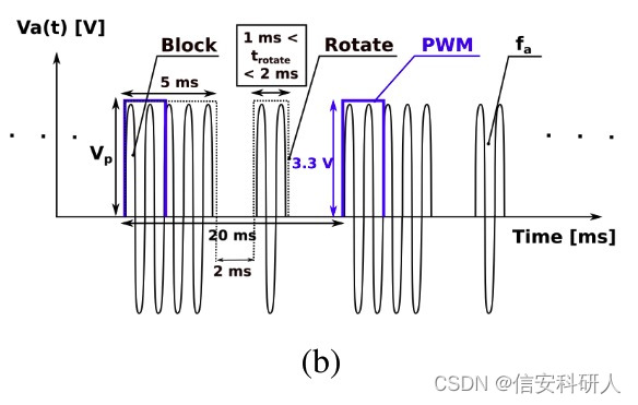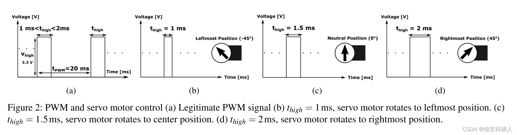 PWM信号通过信号中编码的信息 (例如,旋转角度或速度) 来控制致动器。攻击者旨在阻止成功传输(阻塞攻击)或更改此信息(篡改与注入攻击)以操纵执行器运动。