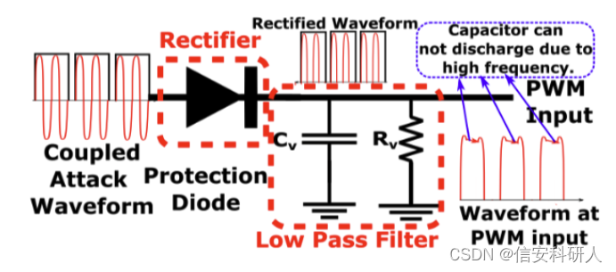 攻击者可以通过使用特定波形来影响传送PWM信号的电路(例如,印刷电路板或电缆上的迹线) 来利用这种现象,从而通过改变表示PWM信号的电压来操纵目标致动器的操作。