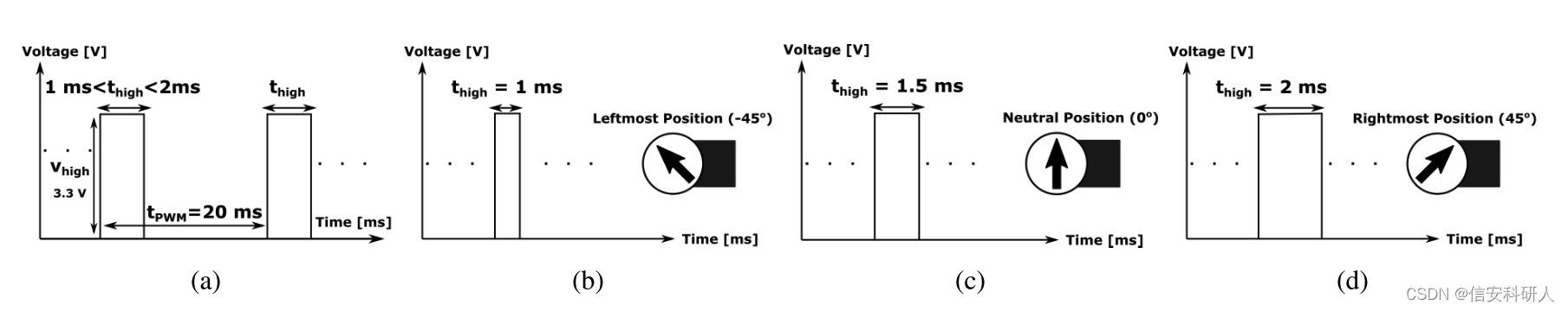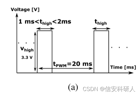 (1)上图可以看到,正常旋转的范围是1~2ms,作者实验观察到,当thigh>2ms时,PWM所携带的信号全被覆盖,所有的伺服模型电机都保持原形。