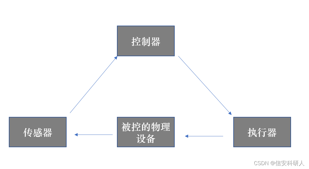 CPS由四大组件构成:执行器、传感器、控制器以及被控对象,基本执行流程如下图