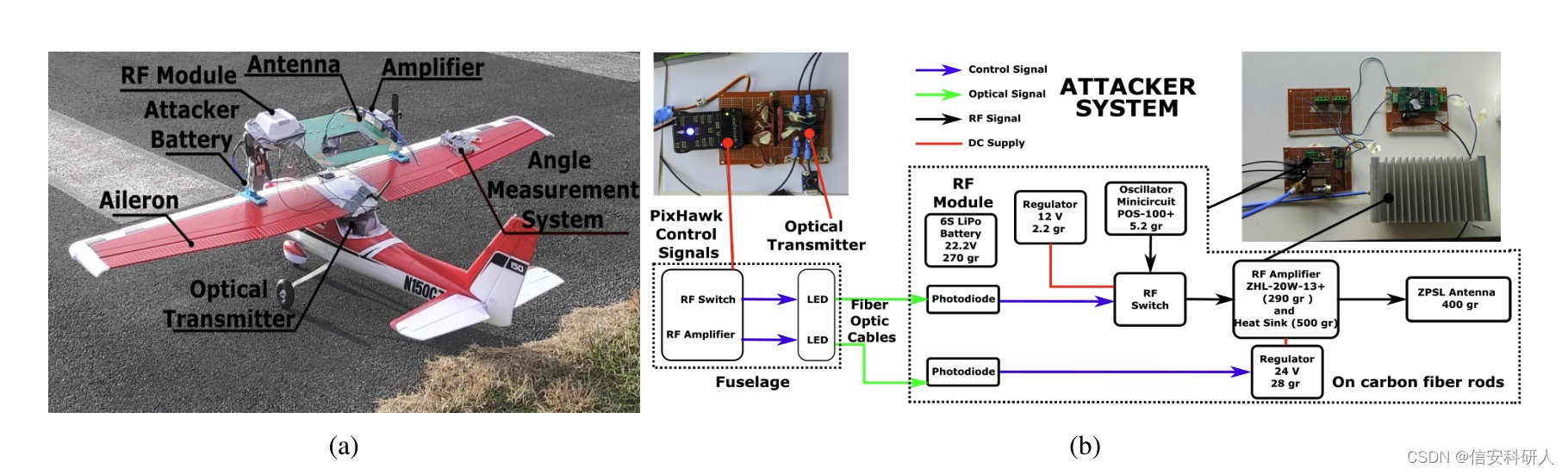 攻击者系统由光发射器和接收器、电池、射频模块、放大器和ZPSL天线组成,如图9b所示。受害者Pixhawk被编程为根据地面控制器的要求发起攻击。攻击控制信号作为光信号发送,以确保即使在高EMI下也能进行可靠的控制,例如在紧急情况下停止攻击。
