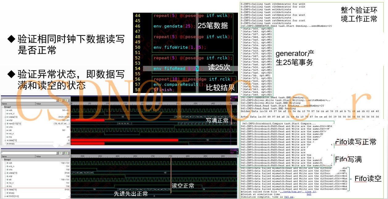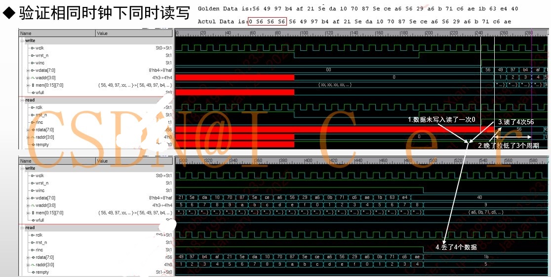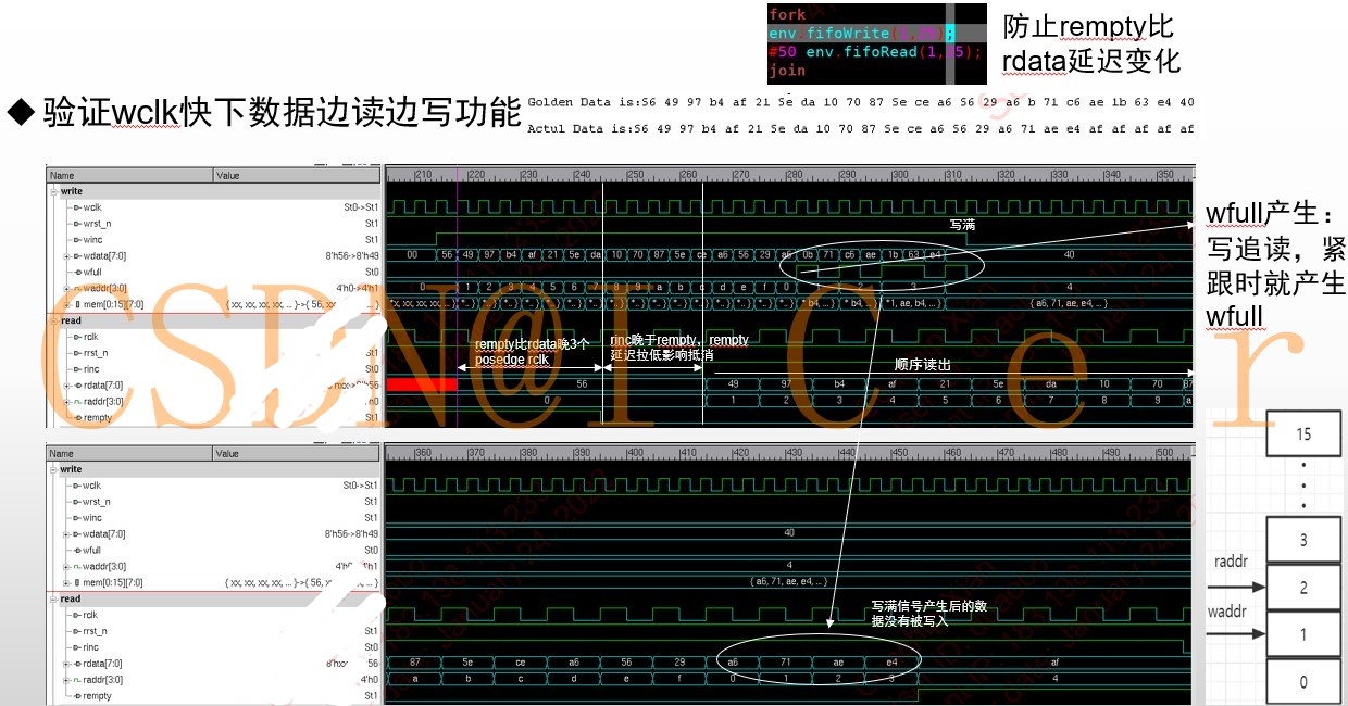 然后验证数据是否能正常写入,正常读出;在异常状态,写满和读空时相应信号是否拉起: