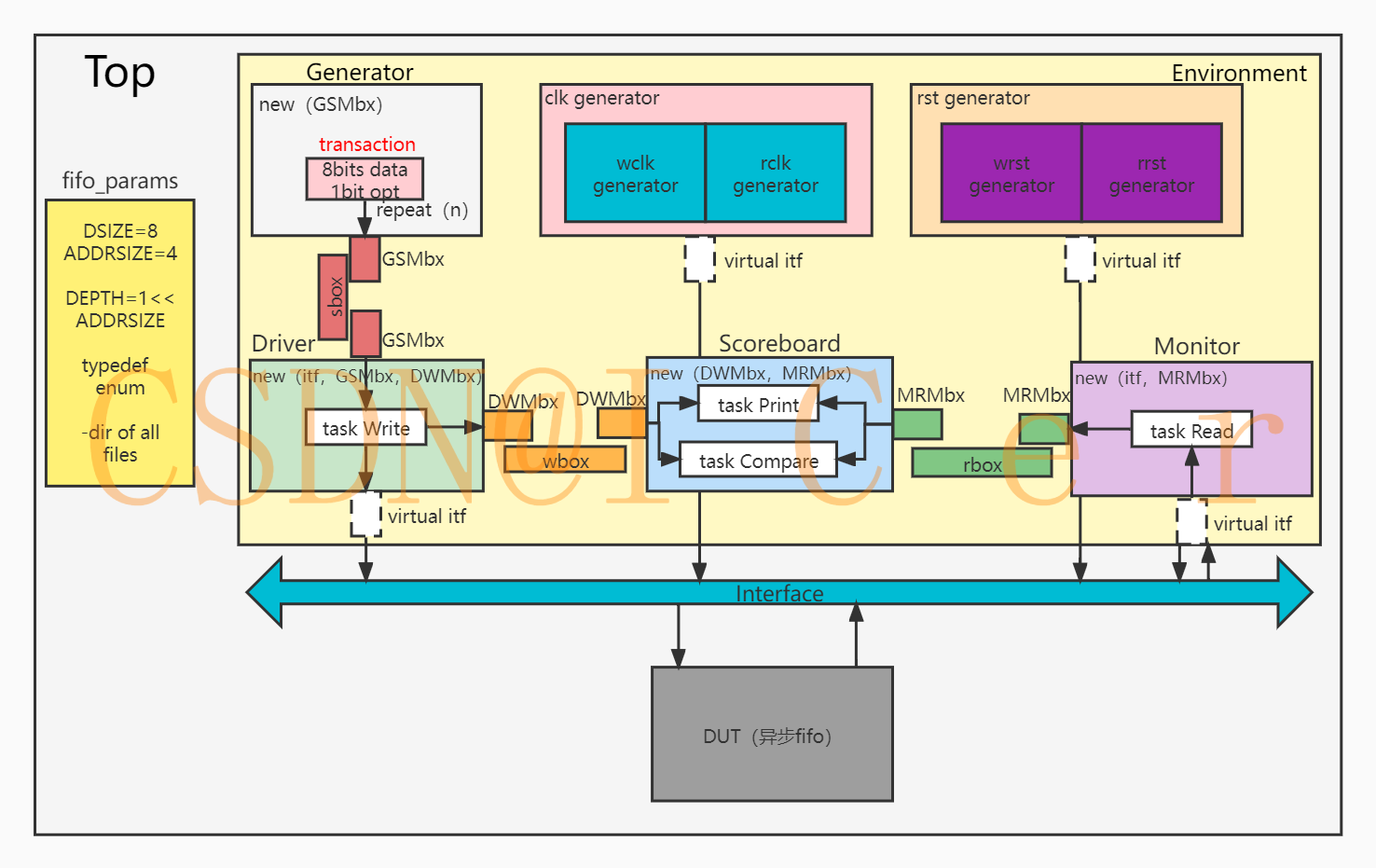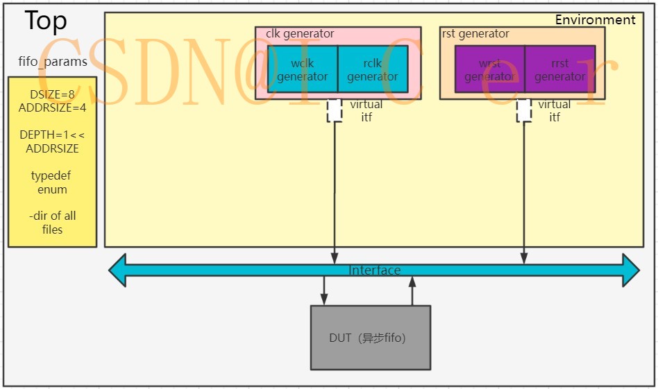 整个SV学习完毕后,为了进一步巩固知识,初步了解并搭建出简单的验证环境,故为一个异步fifo模块儿搭建验证环境;该异步fifo的具体实现及详细介绍可见这篇文章:异步FIFO---Verilog实现
