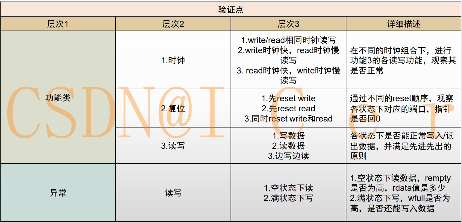 对于验证一个IP,首先要指定验证策略并提取验证点,做出相应的test plan,该异步fifo功能单一简单,故为其指定如下: