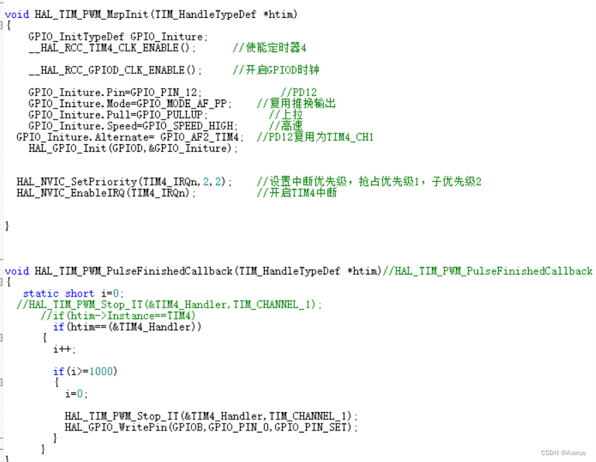 由于想要使用PWM中断,又因为对定义的不明确,我认为的是,既然在TIM4的PWMinit中,已经使用了HAL_TIM_PWM_Start_IT(&TIM4_Handler,TIM_CHANNEL_1)这个函数来开启了时钟4和时钟4的pwm通道中断,那么当然不需要再对定时器本身的中断处理函数进行设置。