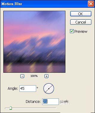 5、对背景副本执行:滤镜 > 模糊 > 动感模糊,这次角度设置为-45度,距离为21不变,效果如下图。