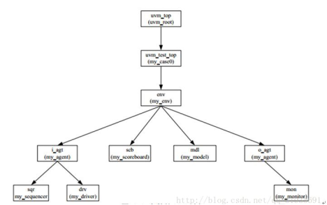 仿真过程中,会先执行build_phase()。该phase用于构建uvm-tree的结构,注:uvm_component组件类必须在build_phase中实例化,build_phase()的主要用途就是实例化组件类,创建和配置测试平台的结构,构建tree,典型的UVM树如下图: