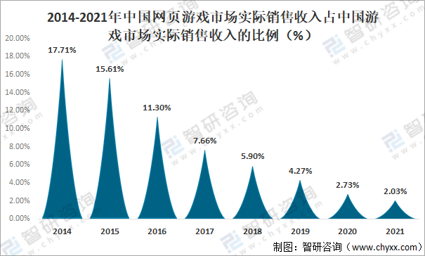 近年来中国网页游戏市场实际销售收入占中国游戏市场实际销售收入的比例逐年下滑,2021年中国网页游戏市场实际销售收入占中国游戏市场实际销售收入的2.03%,较2014年的17.71%减少了15.67%。