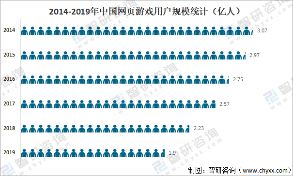 近年来由于用户逐步向移动游戏转移,中国网页游戏的市场份额也在逐年压缩,近年来中国网页游戏用户规模逐年下滑,2019年中国网页游戏用户规模为1.9亿人,较2018年减少了0.33亿人,同比减少14.80%。