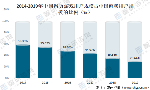 近年来中国网页游戏用户规模占中国游戏用户规模的比例逐年下滑,2019年中国网页游戏用户规模占中国游戏用户规模的29.64%,较2014年的59.35%减少了29.71%。