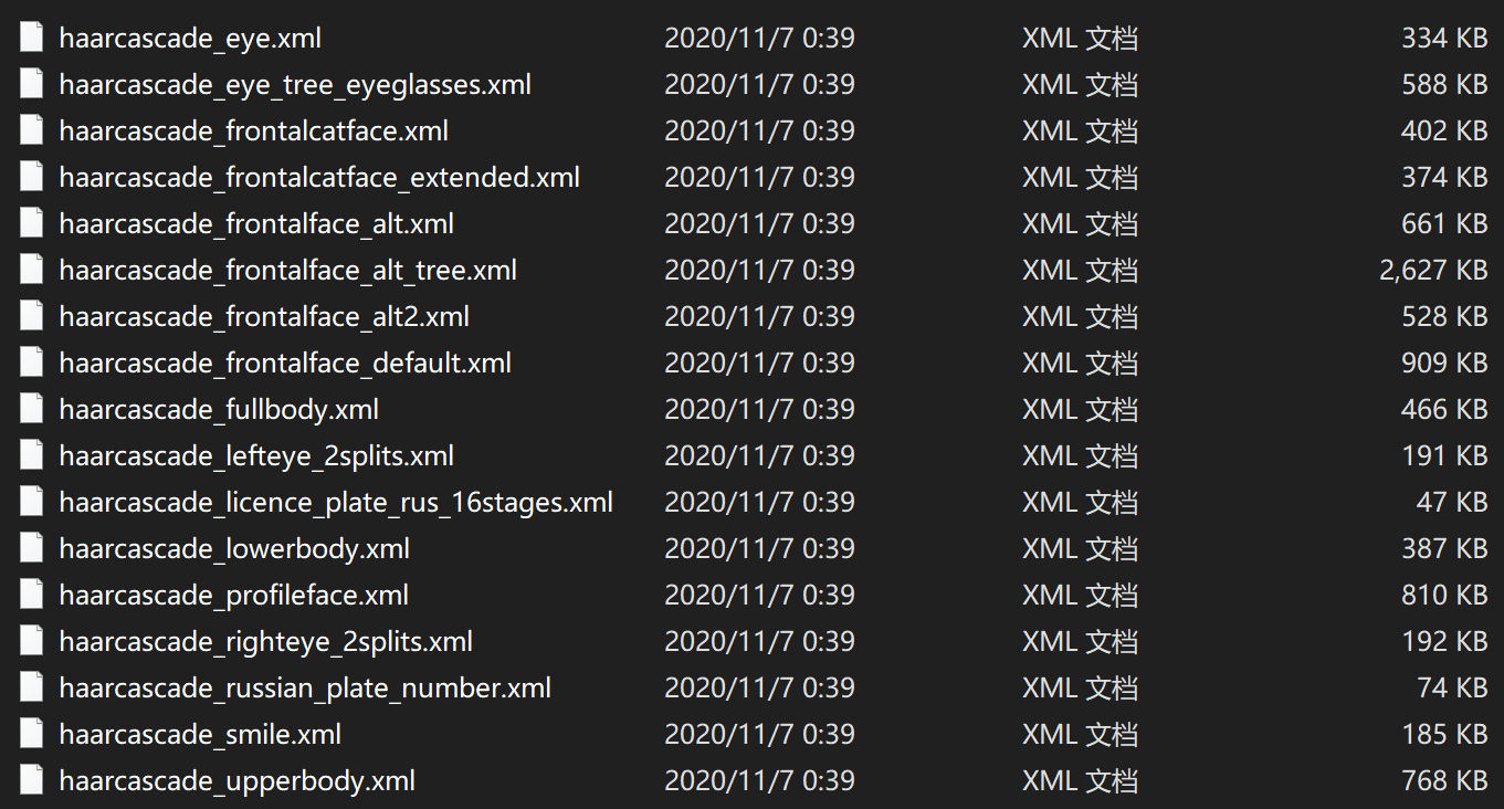 首先我们需要得到官网提供的分类器,也就是已经封装好的几个 xml 文件,如下: