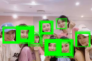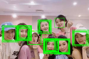 minNeighbors=0,每个人脸都识别出来了,特别的是孟佳(左3)被识别出2次,李斯(右二上)被识别出1次: