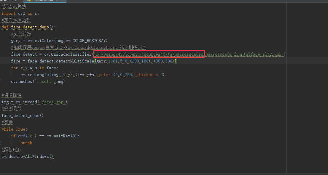 face_detect_demo中和上面的作用差不多,先把图片灰度化,然后加载分类器,然后进行检测,将整张图片中的人脸部分框起来,这部分就是我们得到的人脸照片。