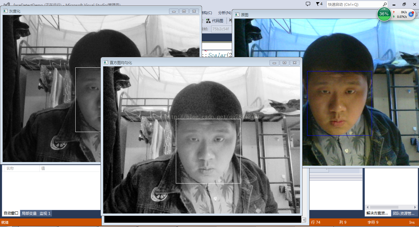 4.对图片进行直方图均衡化(其实可以不处理,上图中原图的标题栏就是未进行灰度处理进行的检测和灰度图是为进行均衡化识别,这里的均衡化是为下节人脸识别打基础)