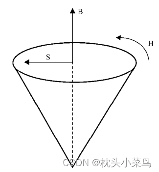 HSB 色彩空间通常用一个圆锥体来表示,圆锥体内部的每个点代表一种特定的颜色,角度位置表示颜色的色调,到中轴线的距离表示饱和度,高度表示亮度。圆锥体的顶点表示黑色,它的色调和饱和度是没有意义的。