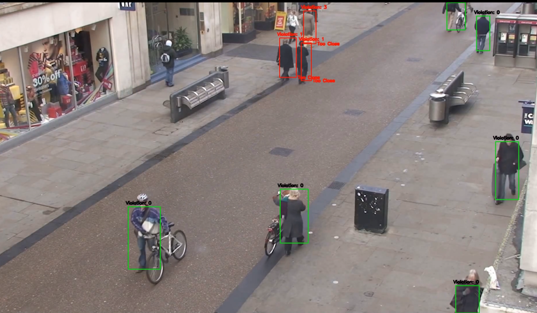 我发现,像素距离为70对于检测那些“似乎”走得太近的人来说是相当合理的。代码的可视化模块会在框太近时亮显红色框,并显示每个框的违规计数。带有结果的示例框架如下所示。