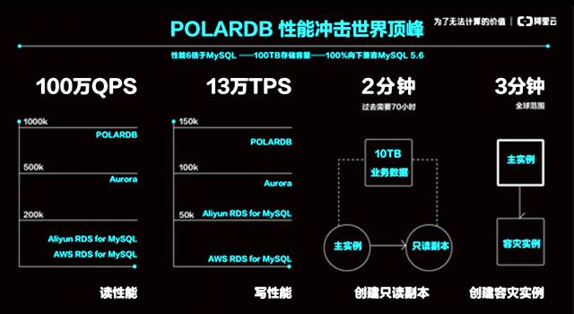 据悉,POLARDB 采用第三代分布式共享存储架构,能实现计算节点及存储节点的分离及集群化,使得 POLARDB 拥有了即时生效的可扩展能力和运维能力。实现支持百T级别容量的无缝扩容、2 分钟即可实现只读副本扩容、1 分钟即可实现全量备份,为企业的快速业务发展提供了弹性扩展能力。