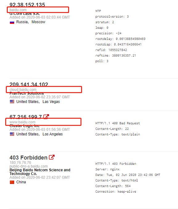 我们使用Shodan主要就是为了做资产收集,所以可以看到我们搜索出来的信息就和baidu相关性很大,它总能让我们发现一些平时发现不了的资产。