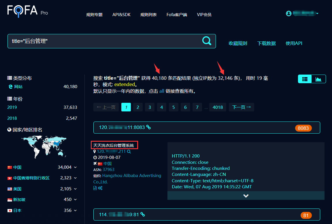 1、搜索页面标题中含有“后台管理”关键词的网站和IP