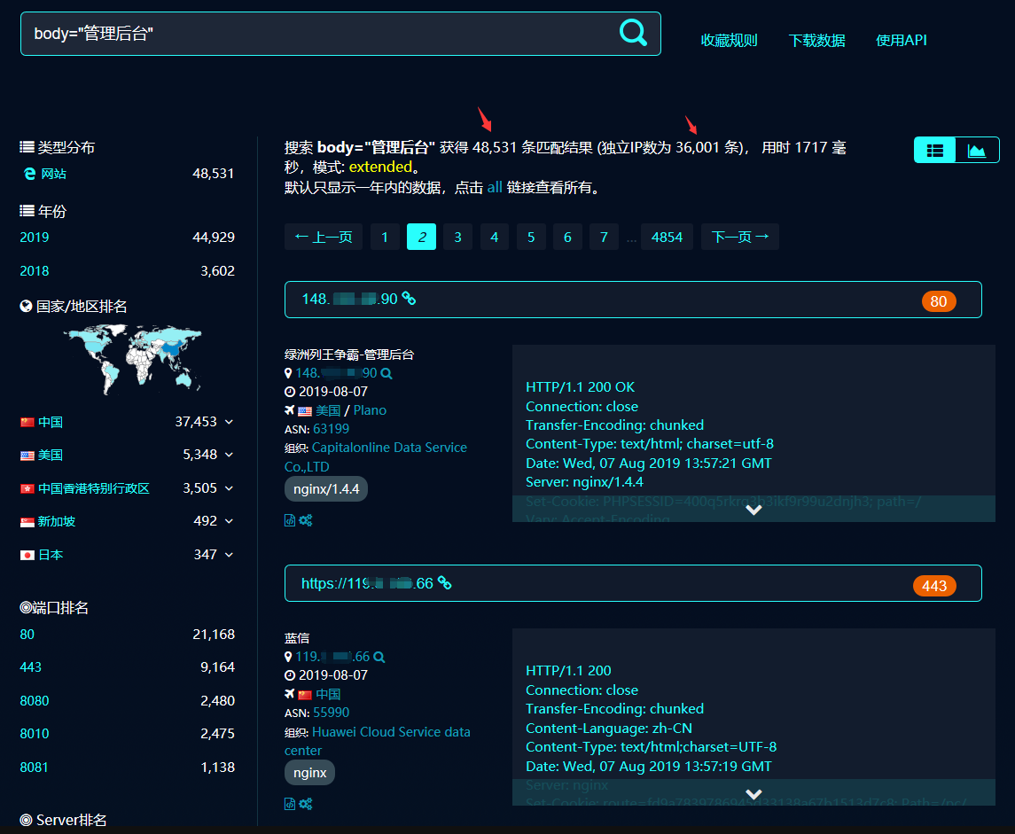 3、搜索html正文中含有“管理后台”关键词的网站和IP