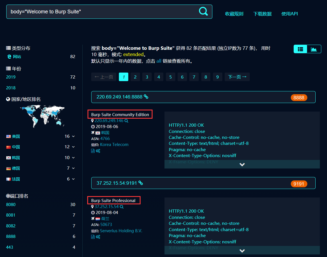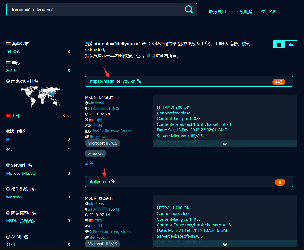 如:搜索HTTP响应头中含有"x-pingback"关键词或"thinkphp"关键词的网站和IP