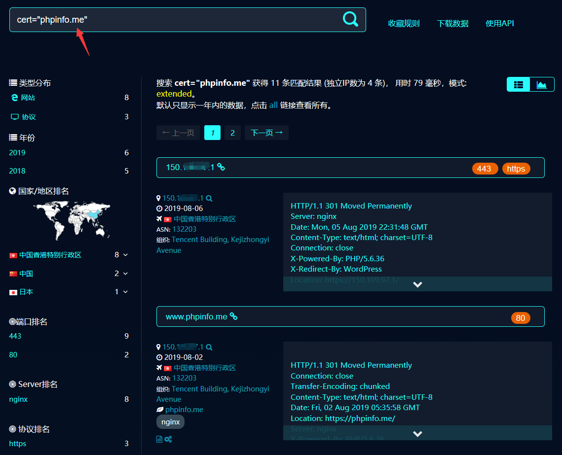 9、搜索证书(如https证书、imaps证书等)中含有"phpinfo.me"关键词的网站和IP