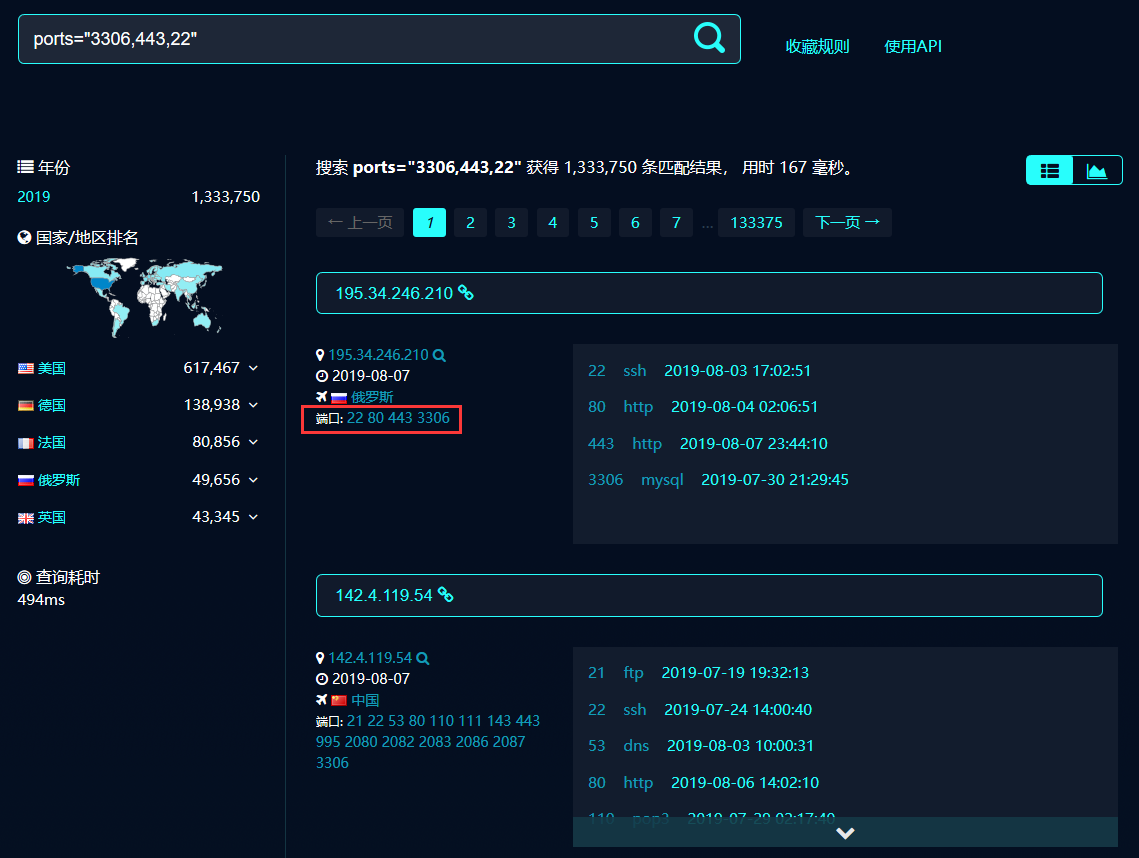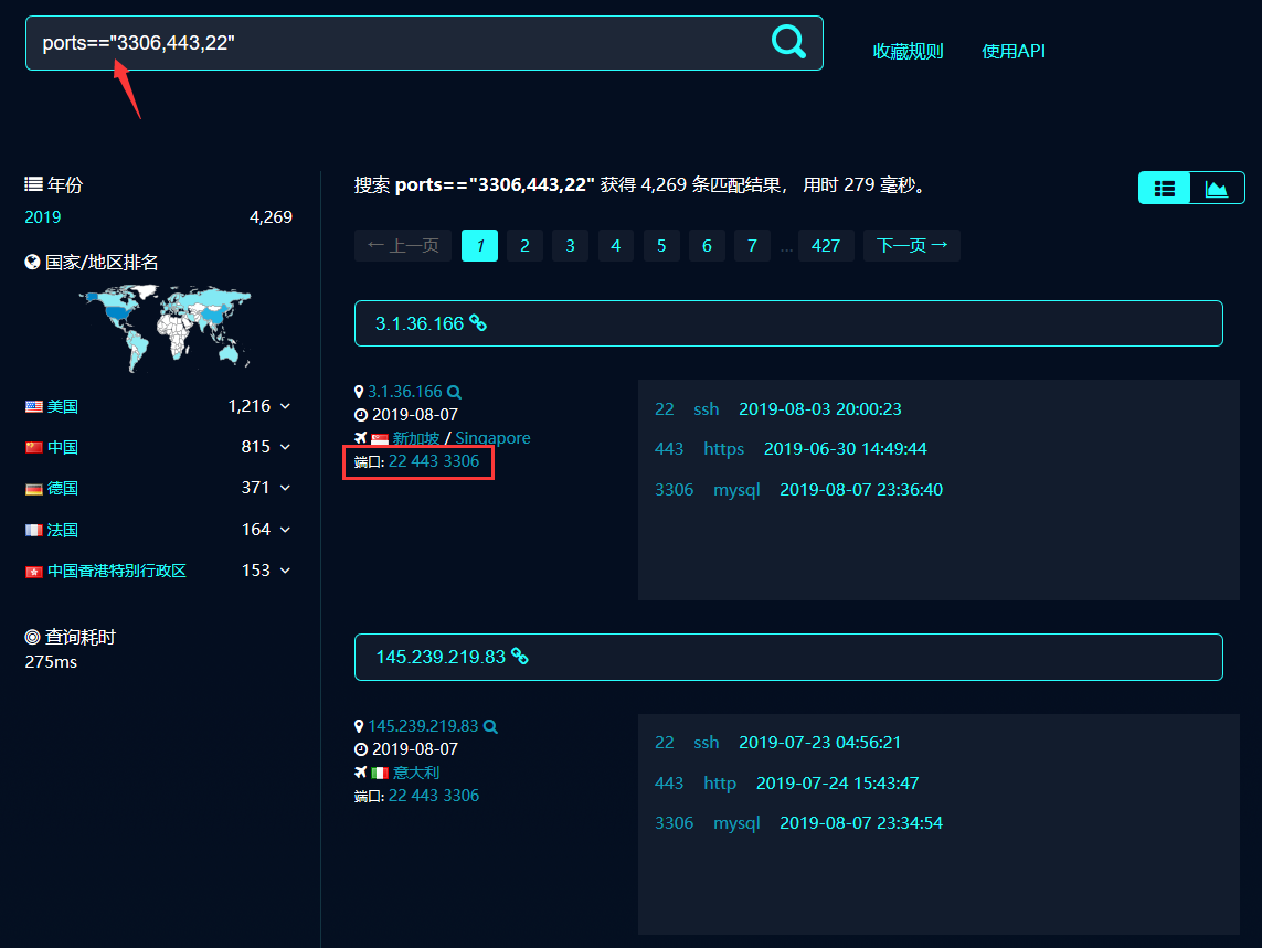 10、搜索同时开启3306端口、443端口和22端口的IP