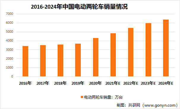 2016-2020年中国电动两轮车销量呈增长趋势,预计2021-2024年中国电动两轮车销量持续增长,预计2024年中国电动两轮车销量将达到6380万台。