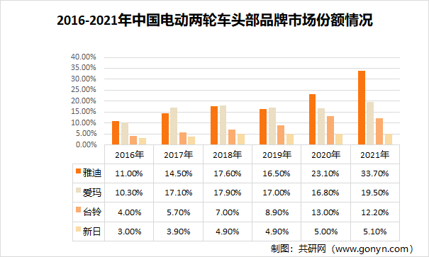 2016-2021年中国电动两轮车头部品牌市场份额情况