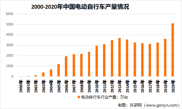 2000年以来,中国电动自行车产量呈增长趋势,2020年,新国标虽有一定的影响,但中国电动自行车产量飙至新阶段,产量达到5109万台,创历史新高。