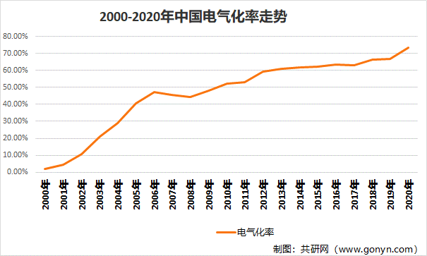 2000年,中国电气化率为2.13%,截止2020年,中国电气化率达到73.61%。随着国内电气化率的加速,电动两轮车销量市场空间广阔。