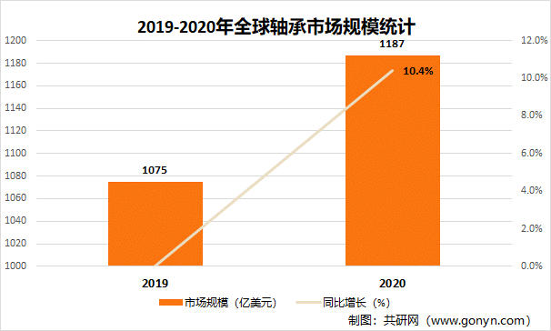 全球轴承行业规模超千亿美元,2019年全球轴承市场规模为1075亿美元,2020年全球轴承市场规模达1187亿美元/+10.5%。预计未来轴承市场规模将持续增长。