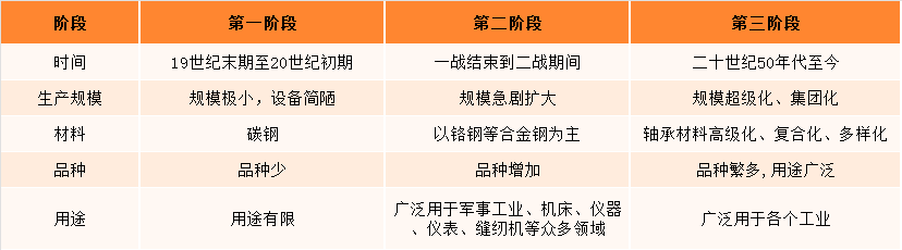 世界轴承的发展经历了三个阶段。第一阶段:世界轴承工业的初创阶段,时间是十九世纪末期至二十世纪初期。主要特点是生产规模极小、设备简陋、技术落后,属于手工作坊式生产;材料以碳钢为主,精度不高,价格却昂贵;品种极少,用途十分有限。当时轴承生产技术只掌握在英国、德国、瑞典、美国等少数企业手中。