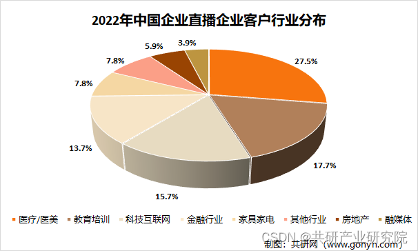 我国企业直播行业发展至今,企业客户的行业分布已经非常广泛。在企业直播的企业客户之中,有27.5%为医疗/医美行业客户,其次教育培训行业占比也较高达到17.7%;科技互联网企业和金融行业使用企业直播的企业客户也较多,分别占比15.7%和13.7%