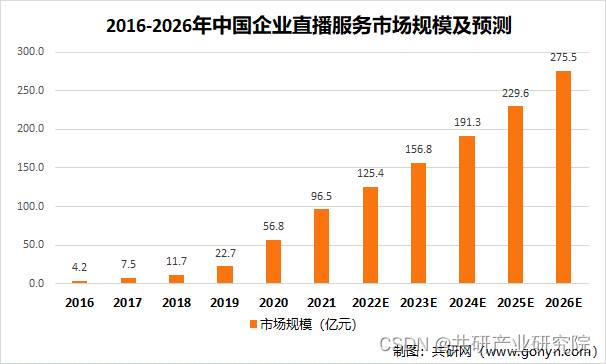数字经济浪潮下,开展数字化转型成为各行业企业谋求生存发展的必由之路,在企业直播3.0时代,直播已成为必不可少的数字化基础设施。2020年已有超过120万家企业使用直播服务,预计2025年将达到270万家。强劲的市场需求,将带来市场规模的持续扩大。2021年中国企业直播服务领域市场规模为96.5亿元,预计2026年将达275.5亿元,年复合增长率23.3%,行业前景广阔。