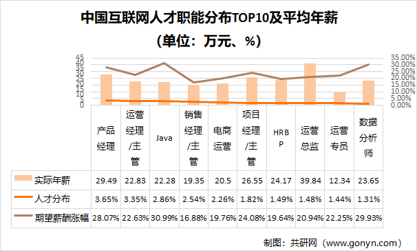 中国互联网人才职能分布TOP10及平均年薪(单位:万元、%)